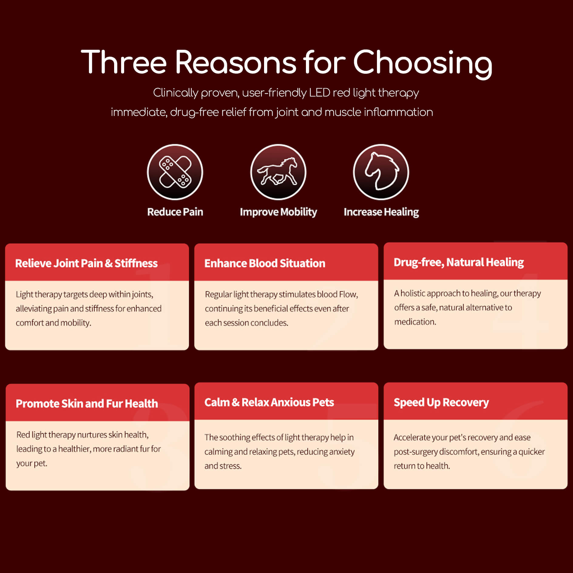 660nm + 850nm is ideal for skin health, pain relief, muscle and joint recovery, inflammation, and pet therapy.